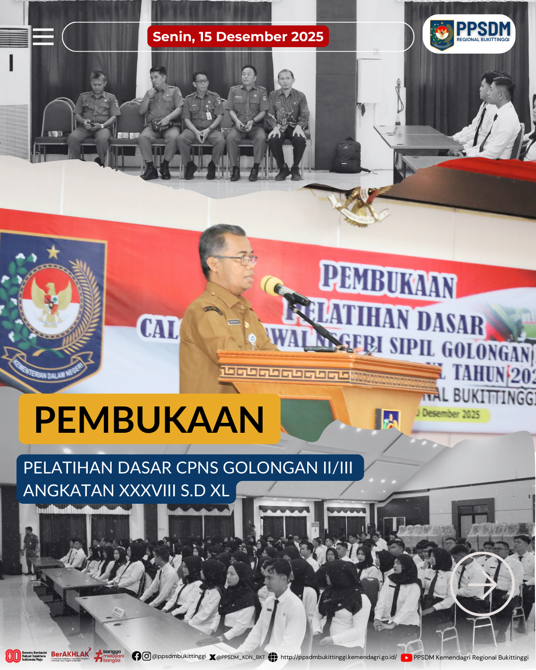 (press release). Bencana yang melanda Aceh, Sumatera Utara dan Sumatera Barat tidak menyurutkan semangat peserta untuk hadir dalam pembelajaran tatap muka. Hal ini menunjukkan tekad awal yang kuat dari peserta untuk melayani masyarakat dan contoh baik bagi aparatur lainnya. BPSDM Kemendagri melalui Sarjayadi selaku Kepala PPSDM Regional Bukittinggi menyampaikan hal tersebut dalam pembukaan Pelatihan Dasar CPNS Gelombang terakhir pada 15 Desember 2025 bertempat di Kampus PPSDM Regional Bukittinggi.