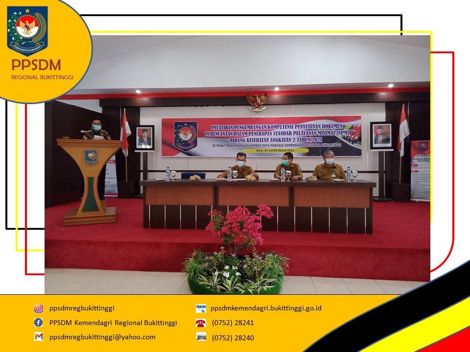 Pelatihan SPM Angkatan 1 dan 2 di PPSDM Kemendagri Bukittinggi berlangsung selama 5 hari mulai dari tanggal 1 Maret sampai dengan 5 Maret 2021. Pelaksanaan kegiatan ini bekerja sama dengan Dinas Kesehatan Provinsi Sumatera Barat dalam hal fasilitasi Tenaga Pengajar dalam perencanaan di bidang Kesehatan. Dalam acara Pembukaan kegiatan Pelatihan, Sarjayadi berharap agar kegiatan pelatihan ini dapat meningkatkan kompetensi peserta dalam merancang dan menyusun dokumen perencanaan khususnya terkait Standar Pelayanan Minimal, serta dapat diaplikasikan di daerah nantinya sehingga tercipta pemberian layanan yang merata dan berkualitas bagi masyarakat Indonesia.