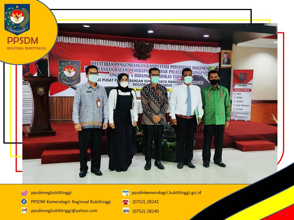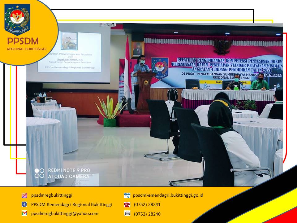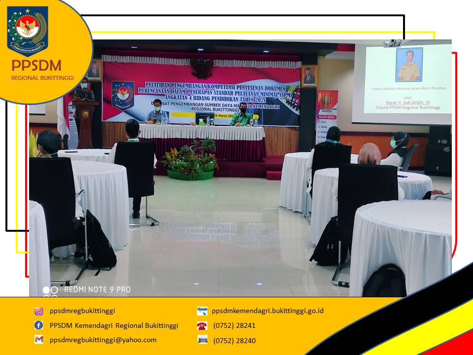 Kegiatan Pengembangan Kompetensi Penyusunan Dokumen perencanaan dalam Penerapan Standar Pelayanan Minimal (SPM) di daerah Tahun 2021 secara resmi ditutup oleh Kepala PPSDM Kemendagri Regional Bukittinggi. Rangkaian penutupan dimulai dari Laporan Koordinator Pelatihan, Defrimen. Dalam laporannya, Defrimen menyampaikan seluruh peserta yang berjumlah 120 orang yang berasal dari 4 angkatan sudah memenuhi seluruh persyaratan yang dilihat dari kehadiran, keaktifan peserta di kelas dan partisipasi peserta dalam post tes dan pre tes serta pelaksanaan tugas-tugas yang diberikan fasilitator, sehingga peserta layak untuk dinyatakan telah menyelesaikan pengembangan kompetensi.