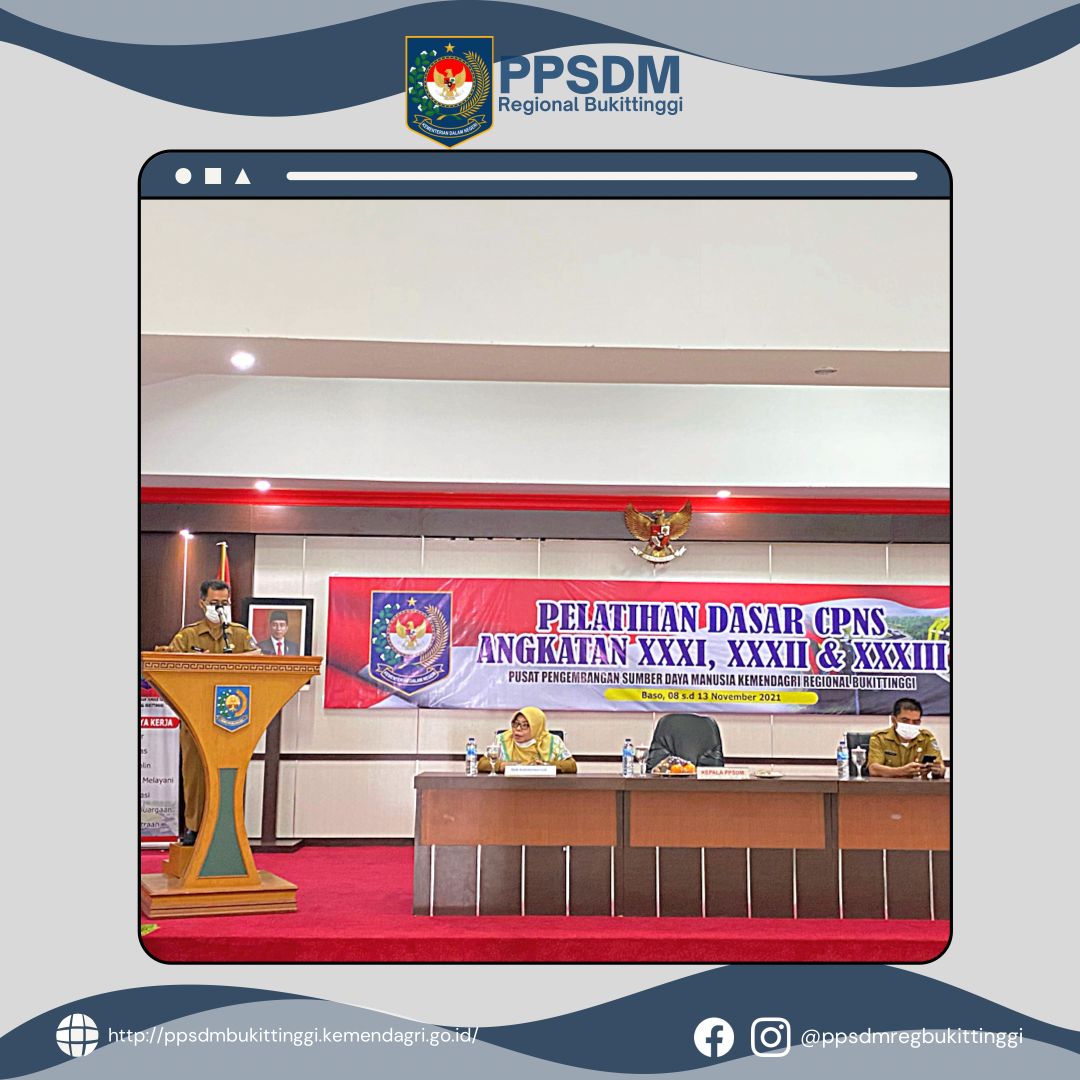 Kegiatan pembukaan di awali dengan laporan oleh Kepala Pusat Pengembangan Sumber Daya Manusia (PPSDM) Regional Bukittinggi, Sarjayadi, yang menyampaikan bahwa Pelatihan Dasar (Latsar) CPNS Angkatan 28 s.d 30 Tahun 2021 dilaksanakan dengan metode Blended Learning, dimana terdiri atas 3 tahapan yaitu tahapan pertama pada tanggal 18 Agustus s.d 11 September 2021 dengan metode Distance learning , tahapan kedua tanggal 13 September s.d 06 November 2021 masa Habituasi di tempat kerja, dan tahapan 3 tanggal 8 s.d 13 November 2021 dengan metode Klasikal atau tatap muka. Peserta Latsar CPNS Angkatan 31 s.d 33 sudah memasuki tahap pembelajaran Klasikal dan mengikuti pembelajaran tatap muka bertempat di lingkungan Kampus PPSDM Regional Bukittinggi di Baso Kabupaten Agam.