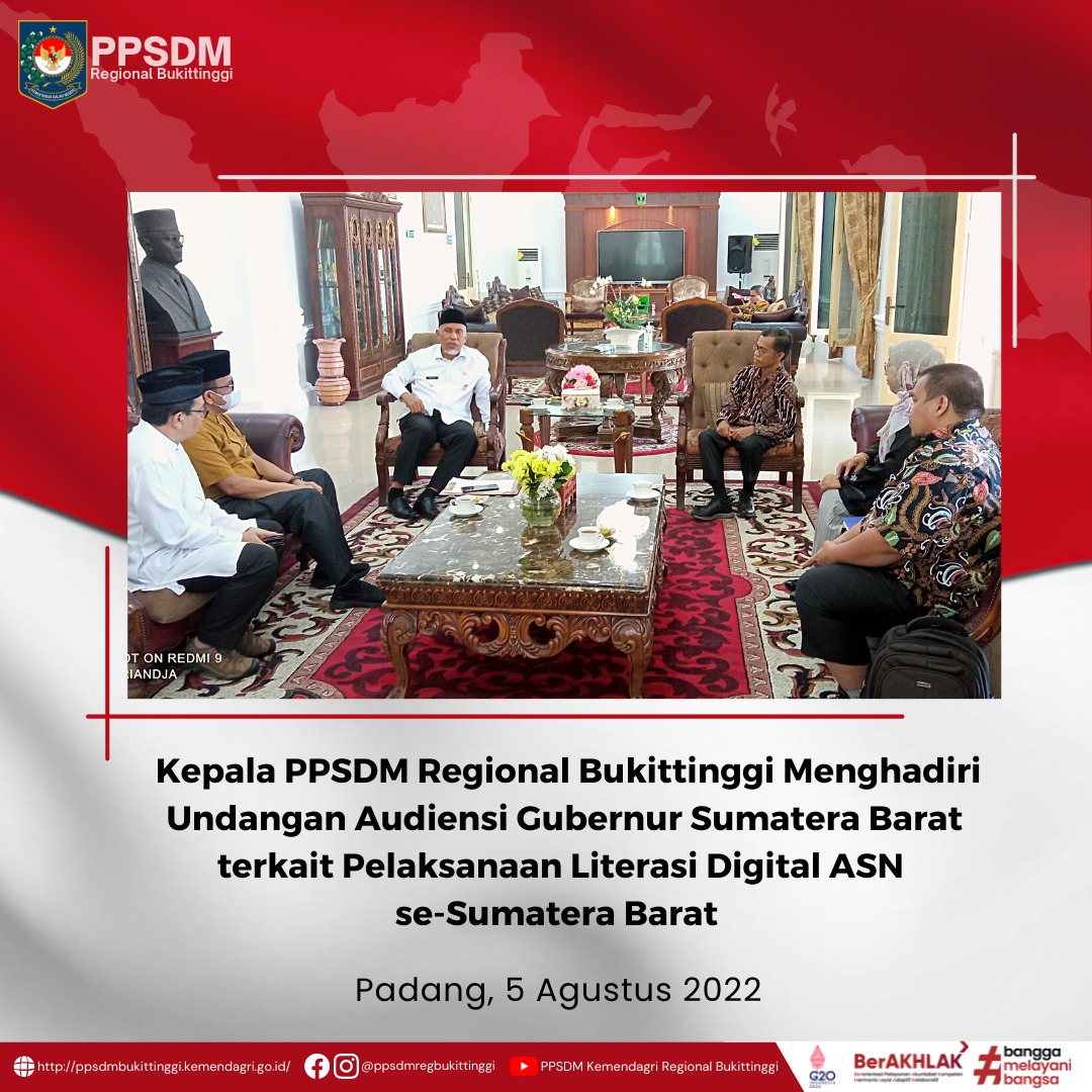 Gubernur Sumatera Barat, Buya Mahyeldi, memberikan dukungan penuh terkait dengan terlaksananya kegiatan Literasi Digital ini. Gubernur mengatakan ” BPSDM, tolong pantau kepesertaan pegawai! Insyaallah saya akan buka pada tanggal 15 Agustus 2022. Pokoknya kita sukseskan kegiatan ini”. Gubernur juga mengulangi pernyataannya ketika rombongan akan berpamitan ” Insyaallah kita sukseskan acara ini dan tolong BPSDM dan Diskominfo bantu fasilitasi kegiatan ini”.