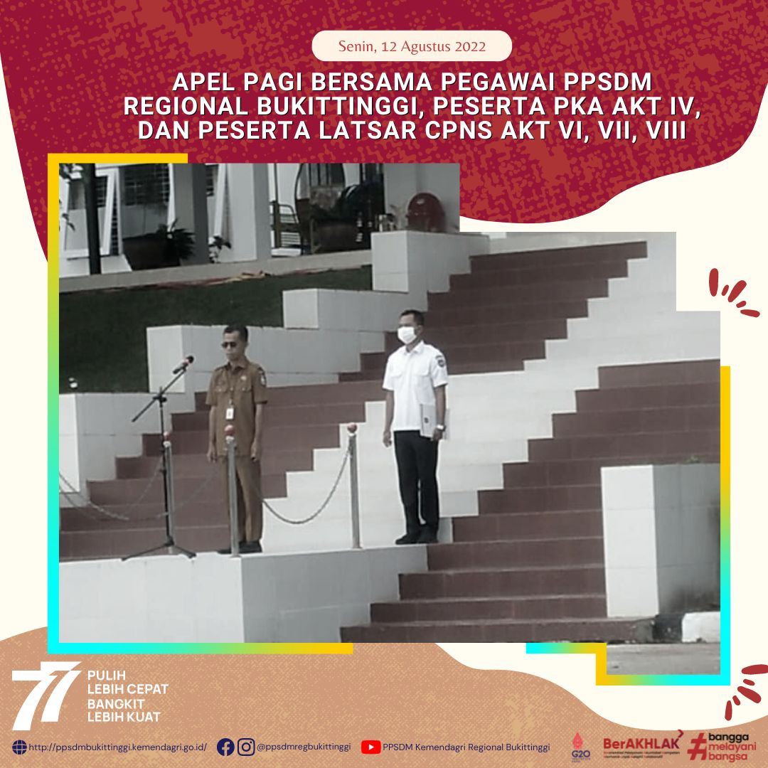 Dalam pelaksanaan apel pagi bersama di lapangan PPSDM Regional Bukittinggi bertindak langsung sebagai pembina apel adalah Kepala PPSDM Regional Bukittinggi, Sarjayadi, dengan petugas pelaksana apel dari pegawai PPSDM Regional Bukittinggi. Apel pagi ini diikuti oleh seluruh pegawai PPSDM Regional Bukittinggi, peserta PIM III angkatan IV, dan peserta Latsar CPNS angkatan VI, VII, dan VIII yang pada minggu ini melaksanakan pembelajaran secara klasikal. Dalam arahannya , Sarjayadi, mengatakan bahwa untuk Latsar pelaksanaan kegiatan masih sama dengan angkatan sebelumnya yaitu pembelajaran klasikal dilaksanakan selama 6 hari kerja. Berbeda dengan peserta PIM, untuk 3 angkatan sebelumnya pelajaran klasikal dilaksankan selama 6 hari pembelajaran dengan pelaksanaan Studi Lapangan dilakukan secara online, sedangkan untuk peserta PIM angkatan VI dan V terjadi perubahan kurikulum oleh Lembaga Administrasi Negara (LAN) sehingga pembelajaran klasikal dilaksanakan 14 hari kerja dan Studi Lapangan dapat langsung dilaksanakan ke daerah yang ditunjuk sebagai tempat pelaksanaan Studi Lapangan.