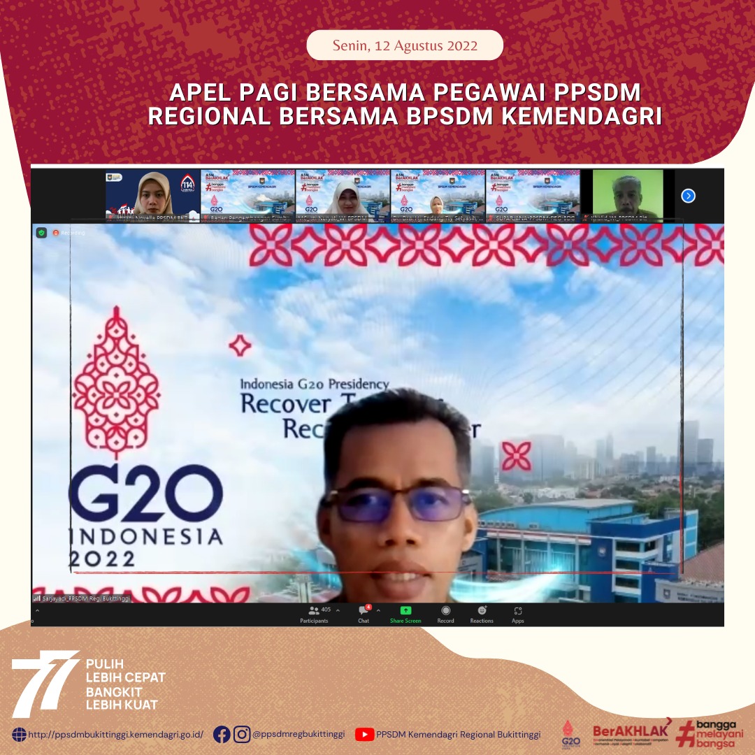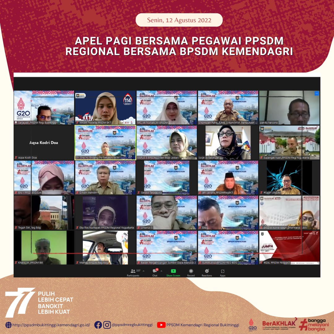 Setelah melaksanakan apel pagi Bersama di lapangan PPSDM Regional Bukittinggi. Kepala PPSDM Regional Bukittinggi beserta seluruh pegawai langsung mengikuti apel gabungan dengan BPSDM Kemendagri, PPSDM Regional, Balai Satpol PP