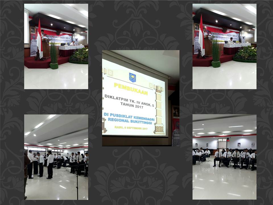 Laporan Kabid Diklat diilanjutkan oleh Sambutan dari Kepala Pusat Pendidikan dan Pelatihan Kementerian Dalam Negeri Regional Bukittinggi, Bapak DR. Ir. H. Suroyo, M.Si. Kapusdiklat membuka sambutannya dengan menyampaikan permohonan maaf atas ketidak hadiran Kepala Badan Pengembangan SDM Kementerian Dalam Negeri disebabkan adanya agenda kedinasan lainnya. Dalam sambutannya Kapusdiklat mengingatkan tentang kepemimpinan yang menunjukkan nilai kedisplinan, prakarsa dan kerja sama karena bangsa Indonesia membutuhkan pemimpin aparatur yang mampu membawa perbaikan dalam semua bidang kehidupan berbangsa dan bernegara. Kapusdiklat juga mengaharapkan perilaku peserta sebagai pemimpin tersebut akan lebih baik selama keikutsertaannya dalam diklat sehingga ketika kembali kesatuan kerja peserta tinggal membuat perilaku tersebut jadi kerja nyata. Selanjutnya, ketukan palu sebanyak 3 kali menjadi penanda dibukanya secara resmi dikat dan penalungan tanda peserta secara simbolik dan diikuiti seluruh peserta.