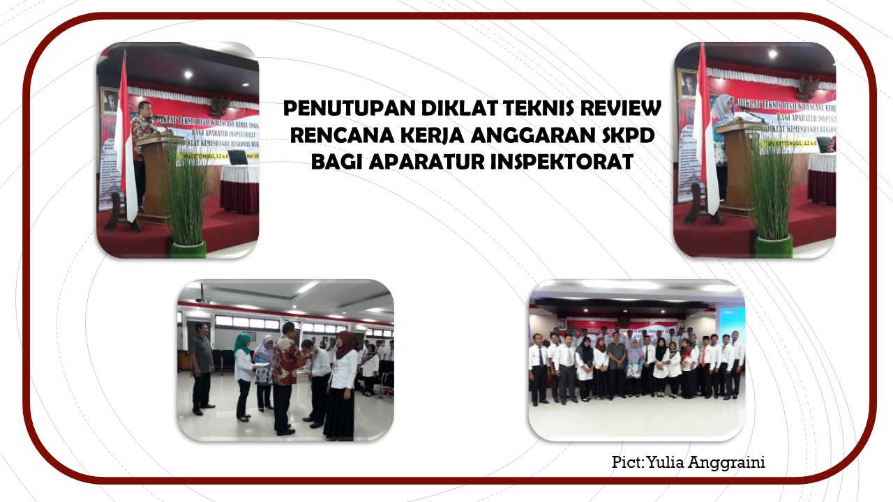 Dalam laporannya, Ibu Ratna Sriwina, M.Si menyampaikan bahwa kegiatan telah berjalan sesuai tujuan pembelajaran yang dikemas mengikuti kurikulum Badan Pengembangan Sumber Daya Manusia (BPSDM) Kemendagri. Selain itu, tenaga pengajar yang berasal dari lingkungan Inspektorat Jenderal Kementerian Dalam Negeri menjadikan proses pembelajaran bukan hanya berisikan teori tetapi praktek nyata yang terjadi pada review anggaran juga turut dihadirkan. Antusiasme yang besar dari peserta pada proses pembelajaran yang berlangsung selama 5 (lima) hari ditunjukkan peserta melalui keaktifan peserta baik dalam kelas maupun di luar kelas. Akhirnya peserta yang telah menyelesaikan diklat diberikan Surat Tanda Tamat Pelatihan yang ditandatangi oleh Kepala Badan Pengembangan Sumber Daya Manusia Kementerian Dalam Negeri.